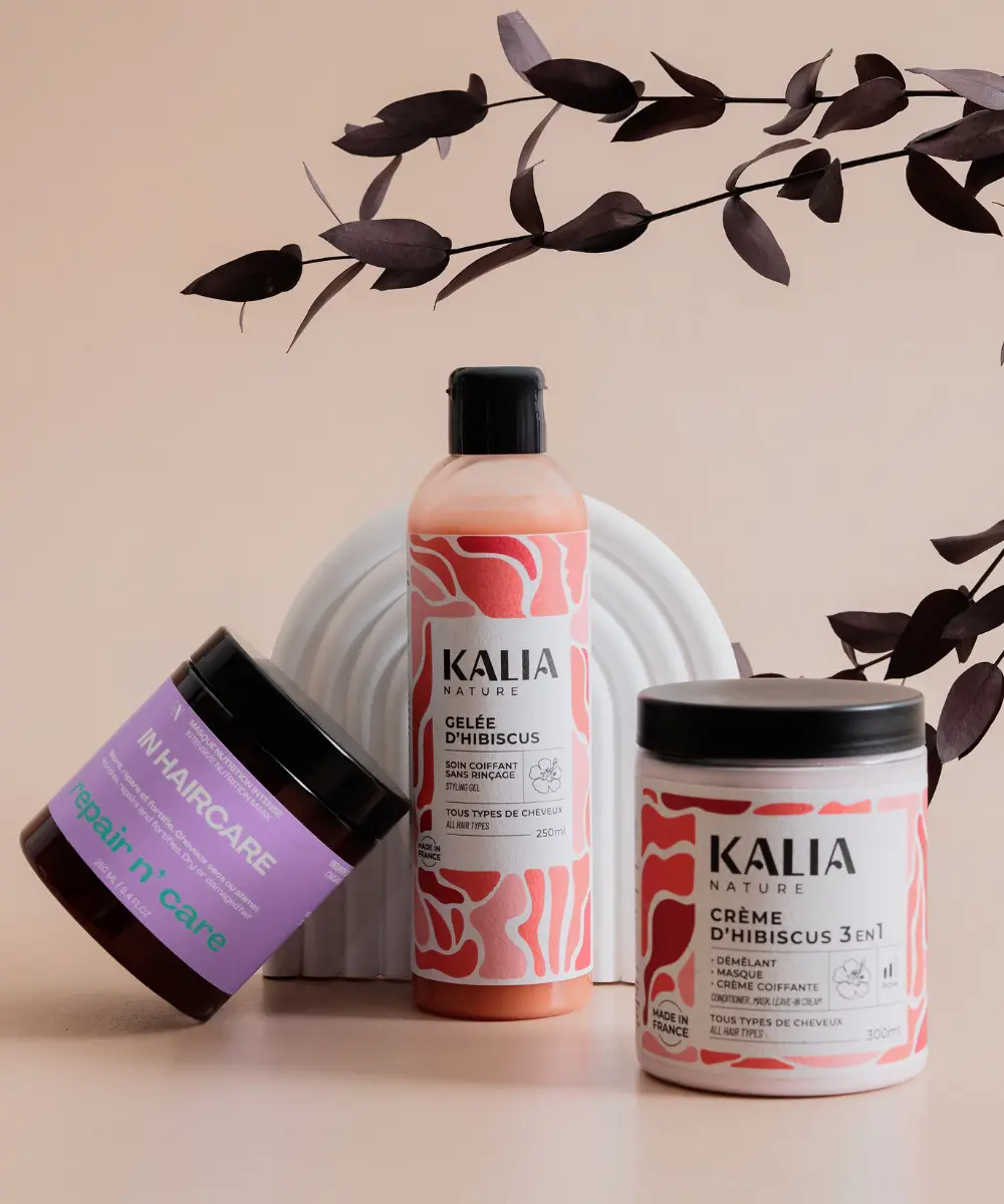 • Gelée Hibiscus Kalia Nature : Apporte tenue et brillance tout en fixant vos boucles naturellement.